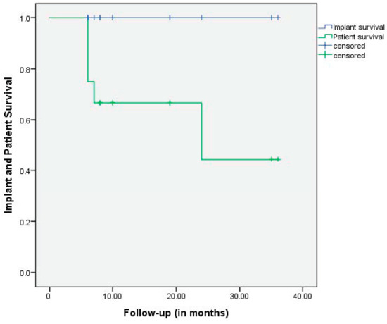 Patient survival and survivorship of the implant with further revision as the endpoint. The overall patient survival was 67% at 1 year and 44% at 2 years.