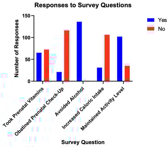 The survey responses were recorded on paper and totaled. Fisher’s exact test was used to determine if there was a significant association between prenatal education and prenatal practices followed using GraphPad Prism version 9.0.0 for Mac, Graphpad Software, Boston, MA, USA,