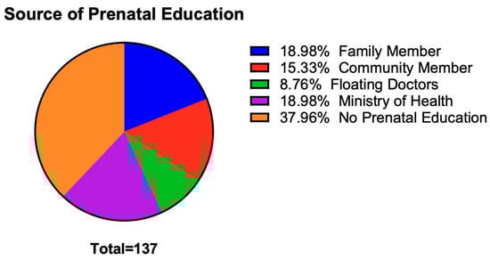 Inclusion criteria consist of women above 18 years of age living in an Indigenous Ngäbe–Buglé community who are currently pregnant and/or had been pregnant in the past and consented to participate. Participants were recruited at eight different Ngäbe–Buglé communities in Bocas del Toro, Panama, while attending Floating Doctor’s mobile healthcare clinics. Women who were waiting to be seen by physicians were approached. Individuals who consented were verbally administered the survey in Spanish away from other patients for privacy. Of the 165 individuals approached, a total of 137 women participated in an anonymous, eight-question survey verbally administered by members of the research team regarding prenatal education and previous or current prenatal practices (response rate of 83%). Participants were asked if they received any form of prenatal education or advice and which source they received it from, including a family member, community member, Floating Doctors, or the Panamanian Ministry of Health. Participants were then asked about pregnancy habits, including if they took prenatal vitamins, avoided alcohol, increased their caloric intake, maintained their exercise level, and received check-ups.