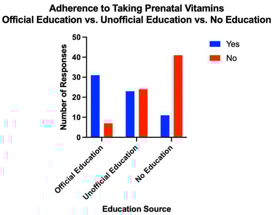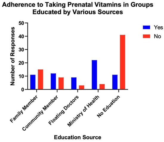Portions of the study did result in statistically significant data. There was a notable difference in adherence to taking prenatal vitamins between those who received education from an official source versus those who were educated by an unofficial source (p = 0.0029). Additionally, there was a true difference in adherence to prenatal vitamin consumption between those who received official education and those who received no education at all (p < 0.0001). Finally, there was even a difference in adherence to prenatal vitamin usage between those who received education from an unofficial source and those who received no education (p = 0.0056). These data reveal that prenatal education from any source may make a significant difference in adherence to prenatal vitamin consumption in Ngäbe–Buglé communities. In particular, official education offered the greatest increase in adherence when compared to any other category. While the confounding factor of free vitamins at official clinics was addressed earlier, prenatal vitamin use still increased significantly among women who received education from sources that did not give away free vitamins. This is encouraging. Additionally, there are fewer environmental or cultural barriers for Ngäbe–Buglé women to take prenatal vitamins than in other categories surveyed. Therefore, it is promising that within this category, there was a statistically significant difference in a woman’s choice to take prenatal vitamins, highlighting the positive impact of prenatal education when barriers are alleviated. When interpreting the other categories, there were no statistically significant differences in the number of participants adhering to a certain prenatal practice based on the source of education received. This lack of statistical significance may be attributed to multiple intrinsic barriers to prenatal care present in an Indigenous community that impede adherence to prenatal practices regardless of a woman’s choice or desire to do so.