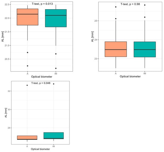 - Huang, J.; Chen, H.; Li, Y.; Chen, Z.; Gao, R.; Yu, J.; Zhao, Y.; Lu, W.; McAlinden, C.; Wang, Q. Comprehensive comparison of axial length measurement with three swept-source OCT-based biometers and partial coherence interferometry. J. Refract. Surg. 2019, 35, 115–120. [Google Scholar] [CrossRef] [PubMed]