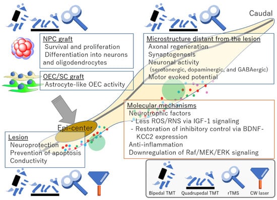 An illustrative overview of the impacts brought about by rehabilitation and regenerative treatment combination. BDNF: brain-derived neurotrophic factor; C.W.: continuous wave; IGF-1: insulin-like growth factor 1; KCC2: kalium-chloride cotransporter 2; OEC/SC: olfactory ensheathing cell/Schwann cell; ROS/RNS: reactive oxygen species/reactive nitrogen species; rTMS: repetitive transcranial magnetic stimulation; TMT: treadmill training [].
