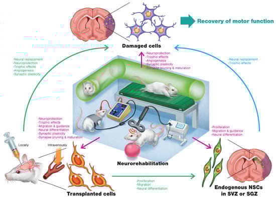 Schematic illustration of regenerative rehabilitation for stroke recovery in an animal model. Possible mechanisms of action related to cell therapy and neurorehabilitation are described. Transplanted cells affect endogenous neural stem cells (NSCs) in the subventricular zone or the subgranular zone, as well as damaged host cells in the infarct area. Neurorehabilitation, such as treadmill exercise, enriched environment interventions, repetitive transcranial magnetic stimulation (rTMS), and transcranial direct current stimulation, not only affects damaged cells but also affects endogenous NSCs and transplanted cells. Combining cell therapy and neurorehabilitation will be able to induce synergistic effects on motor function [].