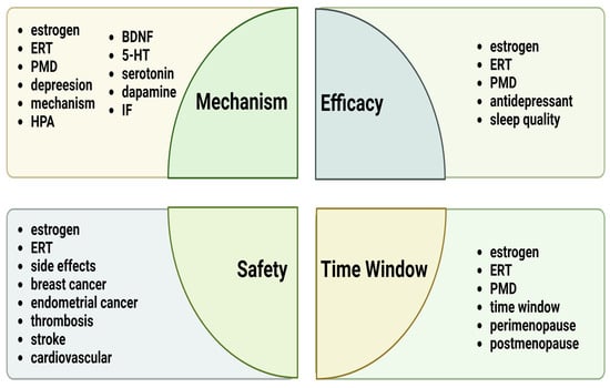 As the economy has expanded at a rapid pace, the social pressure faced by women has gradually intensified. In particular, the prevalence of PMD in women has been on the rise year by year []. This paper examines the potential of ERT for the treatment of PMD in terms of its underlying mechanisms, efficacy, safety, and time window. The preceding four aspects demonstrate that ERT is a viable option for PMD treatment. However, whether ERT causes thrombosis and stroke remains controversial among medical experts and may be closely related to the patient’s health status, estrogen dose, and regimen. More clinical data are needed to further investigate and refine these concerns. Future research should focus on developing ways to mitigate the side effects of ERT. Modifying the method, dose, and duration of estrogen administration can achieve this. Only when we fully understand this complex issue can we effectively utilize it.