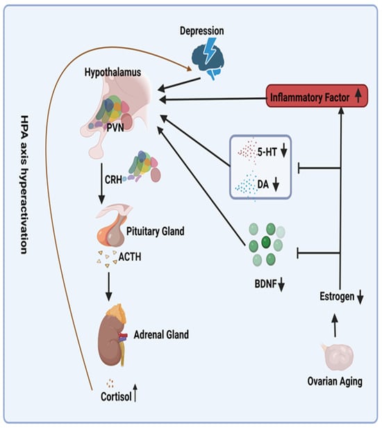 Despite the identification of numerous mechanisms as potential contributors to the PMD process, ovarian dysfunction appears to be a pivotal factor that links these various elements []. Hormones in the ovaries mainly include estrogen and progesterone, and PMD is most strongly associated with the former []. Estrogen originates from the ad-renal glands in addition to the ovaries, so estrogen is primarily regulated by the adrenal glands as a woman enters perimenopause, which brings us to the hypothalamic–pituitary–adrenal (HPA axis). Researchers believe that inflammation and hyperactivity of the HPA axis significantly contribute to the etiology of depression [].