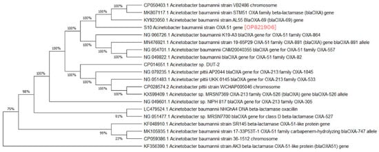 A standardized DNA extraction kit (Thermo Scientific Purification Kit for Genomic DNA; Gene JET Cat#K-0721, Waltham, MA, USA) was used to extract DNA from freshly grown A. baumannii. Carbapenemase-encoding genes, including blaOXA-24, blaOXA-23, blaOXA-58, and blaOXA-51, and MBL-encoding genes, including blaNDM-1, blaVIM, and blaIMP, were amplified by using forward and reverse primers used for PCR as published in our previous study []. The details of the primers used for PCR are also shown in Supplementary Table S1. The amplicons were sequenced, analyzed by BioEdit, and submitted to NCBI GenBank for accession numbers.