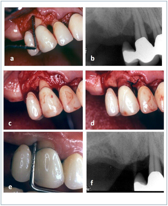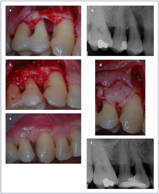 (a) The intrabony defect; (b) X-ray appearance of the defect; the intrabony defect was (c) filled with ABG and (d) covered with a CM; (e) clinical and (f) radiographic appearance of the treated site 1 year after surgery.