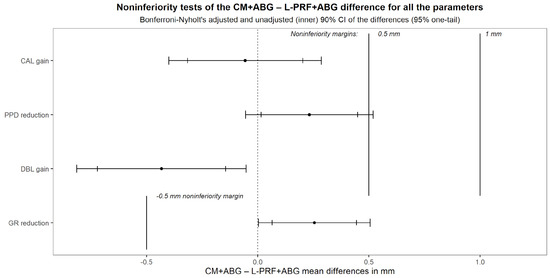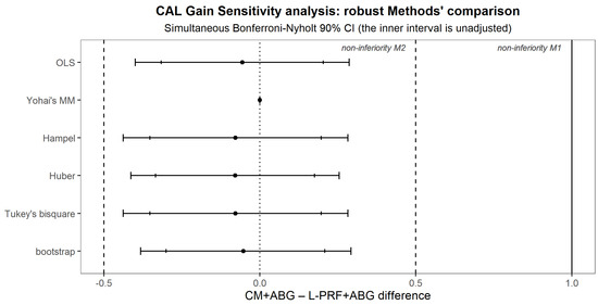 To find evidence of the new treatment non-inferiority, multiple univariate analyses of single outcomes were performed [38]. The difference between the treatment averages of the CAL gain was estimated using an ANCOVA adjusted for baseline with a second-degree polynomial term, and the 90% confidence interval was obtained. Non-inferiority was claimed if its upper bound was less than M2 = 0.5 mm. Secondary outcomes were analyzed similarly. Even though not appropriate for this study, which, not involving disjunction tests, cannot capitalize in chance [39], the following graph shows simultaneous CIs adjusted for the per-family error rate according to Bonferroni, adjusted in turn for the effective independent endpoint number according to Nyholt [40,41] (Figure 4).