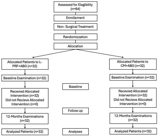 This study was designed as a masked, parallel two-arm randomized non-inferiority clinical trial aimed to evaluate the 12-month clinical and radiographic outcomes for the treatment of unfavorable IBDs using two methods: L-PRF+ABG (test treatment) and CM+ABG (active comparator treatment). Since a previous study [26] demonstrated the non-inferiority of L-PRF against CM when both were associated with Inorganic Bovine Bone (IBB), in this study, we aimed to evaluate whether the same result was obtained when we used ABG, which represents the gold standard of filling materials for bone regeneration [21]. Historically, OFD served as placebo against which to demonstrate effectiveness. The primary outcome considered was CAL gain, and the secondary outcomes evaluated were PPD, Gingival Recession (GR), and Defect Bone Level (DBL). The outcomes were relevant to both a per-protocol and an intention-to-treat population.