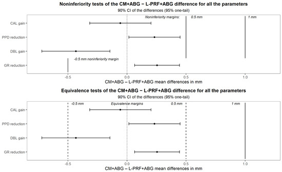 Upper: 90% CI for the difference CM+ABG–L-PRF+ABG between the treatment averages for all the parameters. Lower: equivalence tests of the CM+ABG–L-PRF+ABG differences for all the parameters.