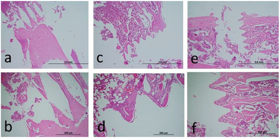 Decalcified histologic images of peri-implant bone tissues of (a): Control, (b): Capsaicin Dosage 1 (25 mg/kg), (c): Capsaicin Dosage 2 (50 mg/kg) (4× magnification, Hematoxilen Eosine, X: 10 times). Decalcified histologic images of peri-implant bone tissues of (d): Control, (e): Capsaicin Dosage 1 (25 mg/kg), (f): Capsaicin Dosage 2 (50 mg/kg) (10× magnification, Hematoxilen Eosine, X: 10 times).
