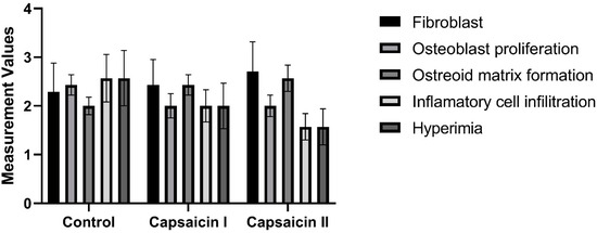 As a result of the analysis, although the BIC was higher numerically in the capsaicin-applied groups, no significant difference could be obtained (p > 0.05). In Table 2, the ratio of osseointegration between the capsaicin treatment groups was measured. In the statistical analysis between the groups, although numerical osseointegration values were higher in experimental groups compared to controls, no statistical difference was found in terms of capsaicin-administered groups’ percentage values when compared with the controls (p > 0.05) (Figure 1).