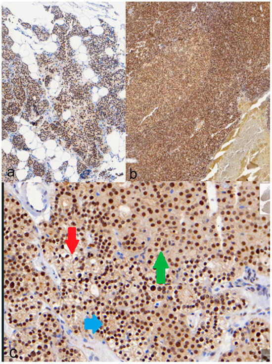 MED12 immunohistochemical staining: (a) positivity in normal parathyroid tissue, (b) a distinct immunophenotype of oxyphil cell nodule in a positive chief cell adenoma; (c) positive chief cells (blue arrow), clear cells (red arrow) and oxyphil cells (green arrow).