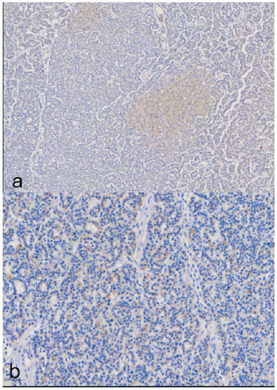 Finally, a clearly distinct immunophenotype was observed in the same adenoma, with groups of nodule-forming cells being either negative in staining or mild intensity compared to the rest of the adenoma that had an intense reaction (Figure 5).