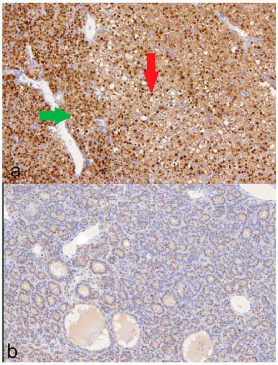 VDR immunohistochemical staining: (a) positive nuclear staining in chief (green arrow) and clear (red arrow) cells; (b) negative (blue) and positive (brown) nuclear staining in chief cells.