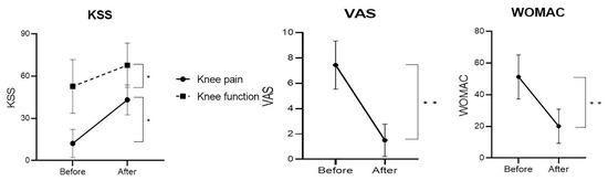 Clinical scores comparing the initial and final Knee Society Score, Visual Analogue Scale, and Western Ontario and McMaster Universities Osteoarthritis Index for knee pain and knee function., p < 0.05 *, p < 0.01 **.