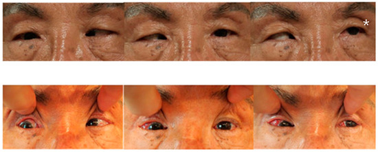 Photos of Case 1 preoperative (upper column) and 1 month postoperative (lower). A 63-year-old patient presented with 100 PD esotropia in the right eye. One month after medial rectus disinsertion and lateral rectus with a 7.0 mm resection of the right eye, he had esodeviation of 10 PD in the primary position of gaze with nearly normal adduction and abduction. * Abduction in left eye was complete preoperatively.