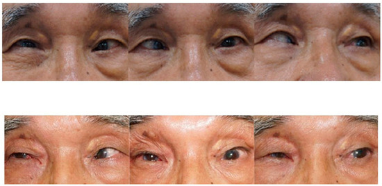 Photos of Case 3 preoperative (upper column) and 1 month postoperative (lower). A 72-year-old patient presented with 90 PD esotropia in the right eye. One month after Jenson operation and medial rectus disinsertion of the right eye, he was orthophoric in the primary position of gaze with nearly normal adduction and abduction.