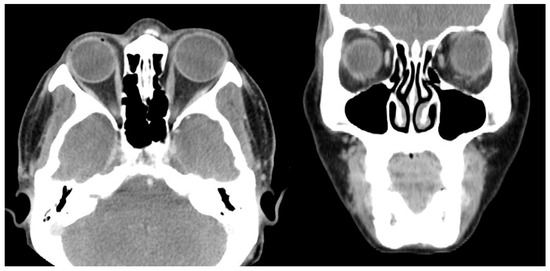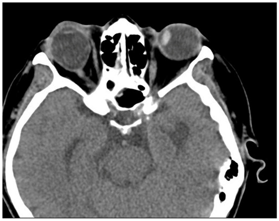 Postoperative CT image of Case 4. No definite abnormality is noted after left medial rectus muscle disinsertion.