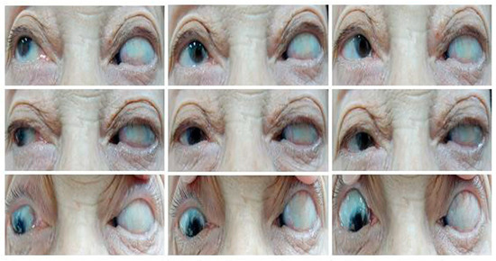 Photos of Case 4 preoperative esotropia in 9 cardinal directions. A 63-year-old patient presented with 100 PD esotropia in the left eye. Two weeks after medial rectus muscle disinsertion and lateral rectus muscle resection of the left eye, she was orthophoric and slightly hypotropic in the primary position of gaze with normal adduction and abduction.