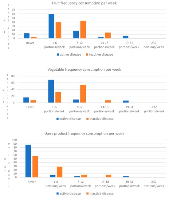 | Dairy products | ≤10 portions/week 11–15 portions/week 16–20 portions/week 21–28 portions/week 29–30 portions/week >30 portions/week | 28 (87.5%) 2 (6.2%) 1 (3.1%) 0 (0%) 1 (3.1%) 0 (0%) | 16 (57.1%) 8 (28.6%) 2 (7.1%) 2 (7.1%) 0 (0%) 0 (0%) | 0.041 |