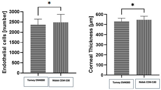 - Módis, L., Jr.; Langenbucher, A.; Seitz, B. Corneal endothelial cell density and pachymetry measured by contact and noncontact specular microscopy. J. Cataract Refract. Surg. 2002, 28, 1763–1769. [Google Scholar] [CrossRef] [PubMed]