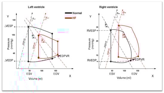 Both the RV and LV share some features in their PV loops, but they differ in their shape, compliance, and response to loading states (Figure 1). The RV loop is triangular, lacking an isovolumetric relaxation phase, with output starting immediately during the systole. Understanding the PV relationship differences is crucial for tailored therapeutic approaches and improved patient outcomes. In HF, the LV–PV loop shifts to the right compared to the normal condition due to an increased LV end-diastolic volume (LVEDV) and end-systolic volume (LVESV), resulting in a decreased LV stroke volume (LVSV), end-systolic pressure (LVESP), and stroke work (LVSW). In HF, the RV–PV loop also shifts right due to an increased RV diastolic volume (RVEDV) and systolic volume (RVESV). Therefore, when exposed to identical volume overload, the RV response is larger compared to the LV, which may be caused by concomitant pulmonary hypertension (PH) []. When there is a chronically increased afterload, the RV pressure–volume relation shifts from a trapezoidal shape, reflecting its high efficiency/low impedance, to a square or rectangular shape, with well-developed isovolumic contraction and relaxation periods, indistinguishable from the normal LV pressure–volume loop.