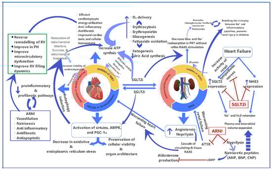 The mechanism of action of the combined use of ARNIs and SGLT2is in HFrEF or HFpEF has been synergistic and promising for bi-ventricular failure (Figure 2). Meta-analyses have highlighted the superiority of this combination over individual therapies in reducing cardiovascular death and all-cause mortality, albeit with an increased risk of volume depletion [,]. Direct comparison trials are needed to determine if one therapy significantly outperforms the other in reducing HF risk and preserving RV function. Some evidence suggests a preference for SGLT2is due to their renal protective benefits in diabetic patients, with effects on myocardial infarction, ischemic stroke, and heart remodeling comparable to ARNIs []. A meta-analysis indicates that a combination of SGLT2is, ARNIs, BBs, and MRAs is highly effective in reducing cardiovascular outcomes in HFrEF patients []. Such combination therapy could improve the RV function in both HFrEF and HFpEF patients. However, high medication costs and limited evidence often limit the simultaneous initiation of both drugs.