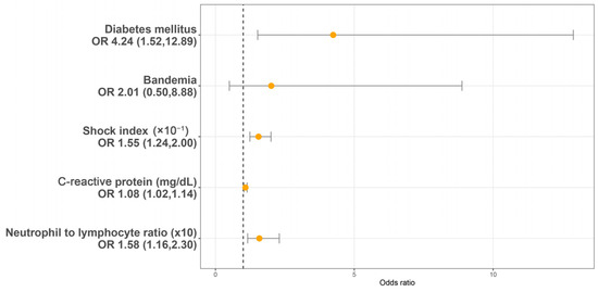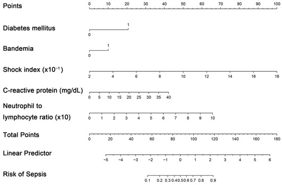Utilizing a LASSO regression model with 10-fold cross-validation, we analyzed variables, including patient characteristics, comorbidities, initial presentations, laboratory findings, urinalysis, and CT findings assessed at the initial ED visit. Following the LASSO regression selection, five variables remained as non-zero coefficients that minimized the overall Lambda and served as the potentially optimal variables for predicting sepsis. These included the shock index (SI), DM, CRP, NLR, and bandemia. Upon incorporating these five variables into a multivariate logistic regression model, four were identified as independently significant predictors of sepsis. These included the SI (×10−1) (OR 1.55, 95% CI 1.54–2.00, p < 0.001), a history of DM (OR 4.24, 95% CI 1.52–12.89, p = 0.007), CRP (mg/dL) (OR 1.08, 95% CI 1.02–1.14, p = 0.005), and NLR (×10) (OR = 1.58, 95% CI 1.16–2.30, p = 0.007) (Figure 2). Subsequently, based on these significant predictors, we constructed a nomogram.