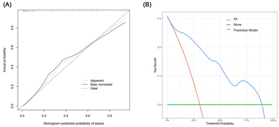 (A) Calibration curve for the sepsis nomogram. The x-axis depicts the predicted sepsis risk, while the y-axis shows the actual diagnosed cases of sepsis. The diagonal dotted line illustrates a perfect prediction from an ideal model. The short-dashed line represents the nomogram’s apparent prediction, with the solid line indicating the nomogram’s performance after bias-correction through bootstrapping (B = 1000 repetitions). (B) Decision curve analysis for the nomogram. The x-axis displays the threshold probability, while the y-axis quantifies the net benefit. The blue solid line represents the nomogram. The red line assumes that all subjects had sepsis, and the green line assumes that none of the subjects had sepsis.