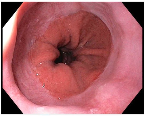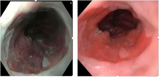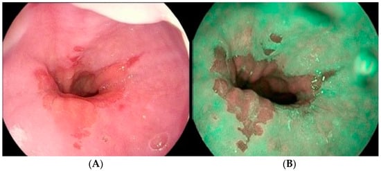 In chromoendoscopy, a contrast agent is sprayed, which stains the tissue and improves the localization and characterization of the abnormal mucosa []. The dyes are categorized into vital and non-vital dyes. Vital dyes such as methylene blue, Lugol’s solution, and toluidine blue are absorbed rapidly by the normal squamous cells. Non-vital dyes, such as crystal violet and indigo carmine, are not absorbed by the cells. They fill the mucosal folds and pits, thereby highlighting the mucosal patterns. Chromoendoscopy is frequently used along with high-resolution and high-magnification endoscopy [,,]. In a study by Yoshikawa et al., using Lugol’s chromoendoscopy in symptomatic GERD patients, 48.7% of patients were found to have positive findings of unstained streaks observed in the distal esophagus when compared with a positive finding of visible esophagitis in 36% of patients on conventional white light EGD [].