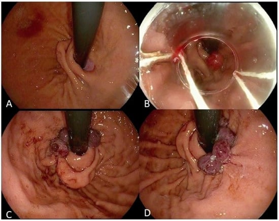 Cardia Ligation Endoscopic Anti-Reflux (CLEAR) procedure: (A) The assessment of cardia. (B) Capture of mucosa at the level of the gastroesophageal junction with the band ligation device. (C,D) Capture of mucosa one by one, oriented towards the lesser curvature of the stomach.