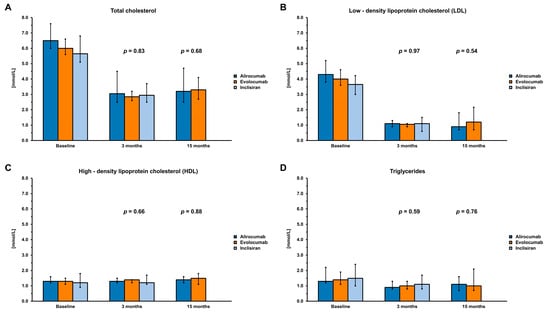 | Baseline | 15 Months | p-Value (Baseline vs. 15 Months) | p-Value (Alirocumab vs. Evolocumab) after 15 Months of Therapy | ||