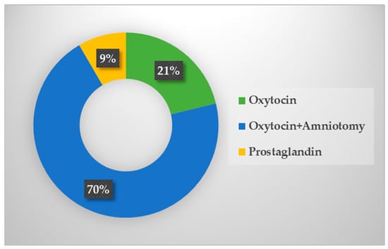 Out of the total number of pregnant women, 48 (21%) were induced only with oxytocin preparation. In 159 (70.35%) pregnant women, in addition to oxytocin, amniotomy was used as a method of labor induction. There were 19 (8.40%) women in which a prostaglandin preparation had to be applied before oxytocin in order to ripen the cervix (Figure 2).