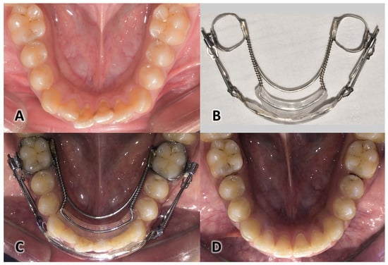 Components of the modified aligner appliance with Ni-Ti springs (MAA): (A) one case is shown before treatment, (B) the MAA components, (C) the MAA placed on the lower arch, and (D) the same case at the end of treatment after removing the MAA.