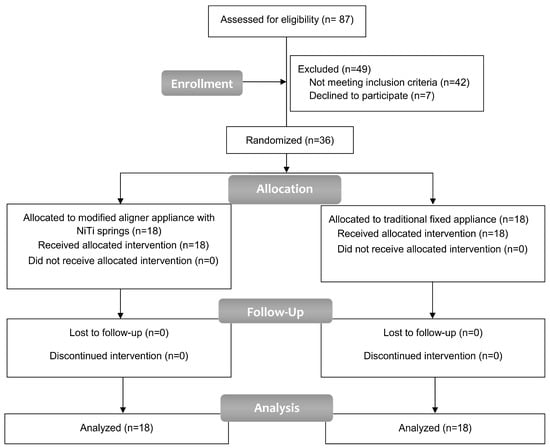 Out of the 87 individuals assessed for eligibility, a total of 36 participants were chosen to participate in this study, and they all finished it. The attrition rate was zero. The CONSORT flow diagram of patient recruitment, follow-up, and entry into the data analysis is given in Figure 2.