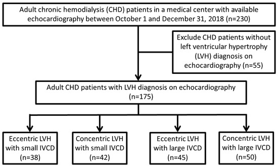 A total of 230 ESKD patients receiving hemodialysis for more than 3 months in a single medical center, with available echocardiographic results between 1 October and 31 December 2018, were enrolled. Fifty-five CHD patients without LVH were excluded. The patients were categorized into four groups based on LVH geometry (eccentric or concentric) and IVCD severity (large or small), as shown in Figure 1. The cutoff point for IVCD, 1.5 cm, was determined using receiver operating curve analysis to minimize the difference between the sensitivity and specificity based on our previous study [15].