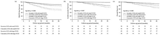 CHD patients with eccentric LVH and small IVCD had the lowest risk of cardiovascular mortality, followed by those with concentric LVH and small IVCD, eccentric LVH and large IVCD, and concentric LVH and large IVCD (p = 0.037; Figure 2b). The same trend risk of overall mortality from eccentric LVH and small IVCD to concentric LVH and large IVCD was noted (p = 0.044; Figure 2c).