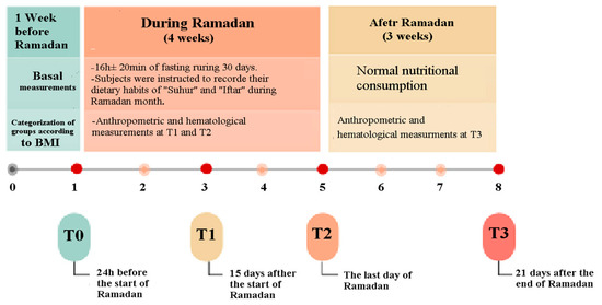 This study was undertaken in Tunisia during the month of Ramadan 2019 (5 May to 3 June 2019). The duration of the fast was between 15 and 16 h per day with a mean temperature of 24 °C. All participants completed their fasting rituals from dawn until sunset for all 30 days of Ramadan. All participants were fully informed about all experimental procedures, benefits, and risks of the study. All measurements of anthropometrics and blood collection were evaluated on 4 separate occasions at the same time of day (within ~1 h): at T0 before the start of the Ramadan month, at T1 15 days after the start of Ramadan, at T2 one day after the end of Ramadan, and at T3 on the 21st day after the end of Ramadan (Figure 1). Venous blood samples (15 mL) were collected by venipuncture during the fasting state between 8 a.m. and 9 a.m. after measuring resting blood pressures first. Each sample was collected in EDTA tubes (purple) containing diaminotetracarboxylic acid.