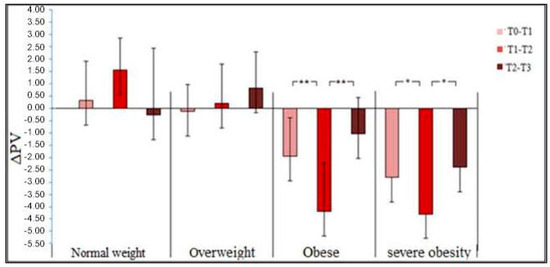 A contrast analysis indicated lower Ht values in the NW group than the grand mean of all OW/OB/SO groups at all time points (T0: −5.28, T1: −6.14, T2: −6.37, T3: −2.27, all p < 0.001). The levels of HB were lower in the NW group than the grand mean of all OW/OB/SO groups at all time points (T0: −2.2, T1: −2.28, T2: −2.58, T3: −2.26, all p < 0.001). The PVV value in the NW group was different than the grand mean of all OW/OB/SO conditions at T0–T1 (1.95, p = 0.02) and T0–T2 (4.32, p < 0.001), but not T2–T3 (0.62, p = 0.51).