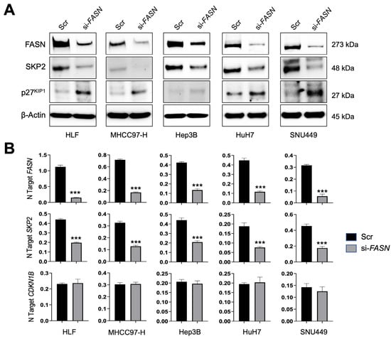 SKP2 is a FASN target in human HCC cell lines. (A) The HLF, MHCC97-H, Hep3B, HuH7, and SNU449 cell lines were subjected to FASN knockdown using a specific small interfering siRNA against FASN (si-FASN). Data were collected 48 h after the silencing. The effects of FASN silencing on FASN, SKP2, and p27KIP1 protein levels were detected by Western blot analysis. β-Actin was used as a loading control. (B) The effects of FASN silencing in the same cell lines on FASN, SKP2, and CDKN1B (encoding p27KIP1) mRNA levels were detected by quantitative real-time PCR. Student’s t-test: p < 0.0001 *** vs. scramble siRNA (Scr). Experiments were conducted three times in triplicate.