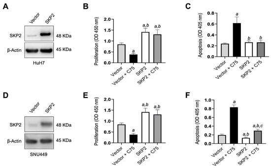 Forced overexpression of SKP2 confers resistance to HCC cells against growth restraint by the C75 FASN inhibitor. The Huh7 cell line was subjected to SKP2 overexpression by stable transfection using an HA-tagged SKP2 plasmid (SKP2). Huh7 cells were also transfected with the empty vector (vector) as the control. Cells transfected with either SKP2 or vector were grown untreated or treated with the FASN inhibitor C75 (25 µM) for 48 h. (A) Increased levels of SKP2 protein following transfection of the SKP2 plasmid in Huh7 cells, as detected by Western blot analysis. β-Actin was used as a loading control. Transfection of SKP2 increases proliferation (B) and diminishes apoptosis (C) in the same cells. C75 administration significantly reduces proliferation and augments apoptosis in vector-transfected but not SKP2-transfected cells. (D–F) Equivalent results were obtained in the SNU449 cell line. Tukey–Kramer’s test: p < 0.0001; a, versus empty vector (vector); b, versus vector-transfected and C75-treated cells (Vector + C75); c, versus SKP2 overexpression. Experiments were conducted three times in triplicate.