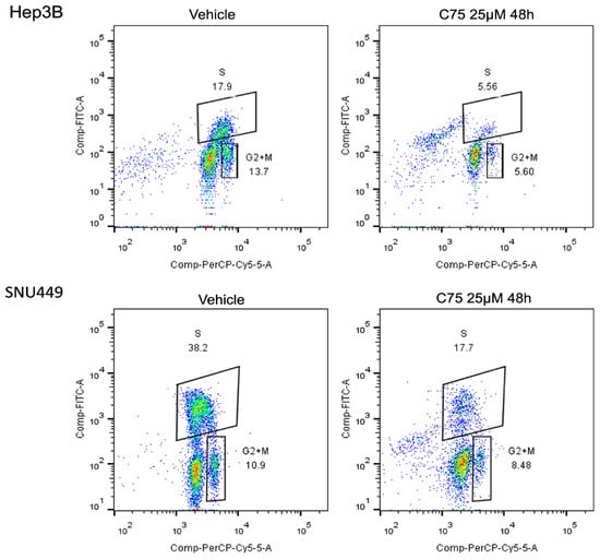 Subsequently, to further substantiate our findings, we determined whether forced overexpression of SKP2 in HuH7 cells might counteract the anti-growth effects of the FASN inhibitor C75 []. Therefore, the SKP2 cDNA was stably expressed in Huh7 cells, and the empty vector was stably transfected as a control (Figure 2A). Administration of C75 induced significant growth restraint of Huh7 cells transfected with the empty vector compared to untreated cells by reducing proliferation (Figure 2B) and augmenting apoptosis (Figure 2C). In contrast, no growth differences were observed between untreated cells and those stably overexpressing SKP2 treated with C75. SNU449 cells stably transfected with SKP2 displayed similar results (Figure 2D,E). Moreover, cell cycle analysis indicated a decrease in the S phase when HCC cells were subjected to C75 (25 µM) administration (Figure 3), si-FASN treatment, and, to a lesser extent, si-SKP2 treatment (Figure 4). C75 exerted a broader effect on HCC cells (Figure 3), presumably due to the possibility of affecting targets other than FASN, in accordance with previous findings []. These findings imply that the anti-growth properties of C75 are at least partly mediated by the drug’s effects on the FASN/SKP2 axis.