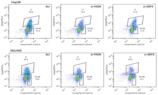 Dot spot graph representative of cell cycle distribution of HCC cells treated with si-FASN and si-SKP2 30 nM for 48 h. For the analysis, cells were recovered, washed with PBS and the pellet solubilized in ethanol 70% and stored at −20 °C overnight. The samples were stained with 7AAD (BD Biosciences, CA, USA) and incubated for 15 min at room temperature before acquisition using the flow cytometer FACS CANTOII (BD Biosciences, CA, USA). A total of 30.000 events for each sample were acquired and data were analyzed with ModFIT LT 6.0 (Verity Software House).