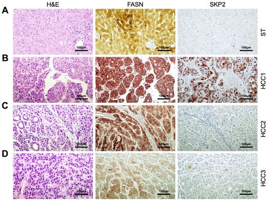 Mouse and human liver lesions, fixed in 4% paraformaldehyde overnight at 4 °C and embedded in paraffin, were evaluated by two board-certified pathologists and liver experts (M.E. and S.R.) following the criteria by Frith et al. []. For immunohistochemistry, antigen retrieval was achieved in 10 mM sodium citrate buffer (pH 6.0) by placing in a microwave on high for 10 min, followed by a 20 min cool down at room temperature. After a blocking step with the 5% goat serum and Avidin-Biotin blocking kit (Vector Laboratories, Burlingame, CA, USA), the slides were incubated with primary antibodies overnight at 4 °C. Slides were then subjected to 3% hydrogen peroxide for 10 min to quench endogenous peroxidase activity. Subsequently, the biotin-conjugated secondary antibody was applied at a 1:500 dilution for 30 min at room temperature. The anti-FASN (# 3180; 1:200 dilution; Cell Signaling Technology), anti-SKP2 (# ab183039; 1:50 dilution; Abcam), HA-Tag (# 3724; 1:400; Cell Signaling Technology), and V5-tag (# R960-25; 1:100; Thermo Fisher Scientific) antibodies were applied for immunohistochemistry. The immunohistochemical reaction was revealed with the Vectastain ABC-Elite Peroxidase Kit (# PK-6100; Vector Laboratories, Burlingame, CA, USA), using the ImmPACT NovaRed Substrate Peroxidase (# SK-4805; Vector Laboratories) as the chromogen. Slides were counterstained with Mayer’s hematoxylin.