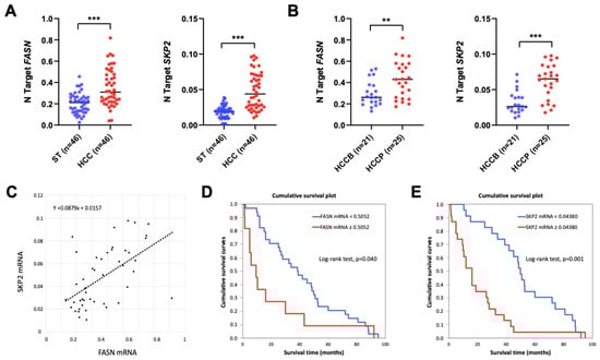Subsequently, the mRNA levels of FASN and SKP2 were investigated in the HCC samples from the same collection for which frozen tissues were available (n = 46; Figure 6). Levels of FASN and SKP2 were significantly higher in HCC specimens compared with corresponding non-tumorous surrounding tissues (p = 2.42625 × 10−6 and p = 1.04229 × 10−10, respectively; Figure 6A). In addition, the expression of FASN and SKP2 genes was more elevated in HCCP than in HCCB specimens (p = 0.004935 and p = 1.68832 × 10−5, respectively; Figure 6B). Furthermore, the mRNA levels of FASN and SKP2 were directly correlated in the human HCC specimens analyzed, as detected via the Pearson correlation coefficient and Spearman correlation coefficient (non-parametric; p < 0.0001), as well as with a scatter plot (Figure 6C). These findings further substantiate the interaction between FASN and SKP2 in hepatocellular carcinogenesis. Subsequently, we determined whether the mRNA levels of FASN and SKP2 were associated with patients’ survival. Patients’ specimens were stratified into low and high gene expression according to cut-points selected using a minimal p-value approach. Kaplan–Meier analysis revealed that a high expression of FASN and SKP2 is associated with poor prognosis (Figure 6D,E). Cox regression analysis confirmed that high levels of both FASN and SKP2 are independent adverse prognostic factors for HCC (Supplementary data).