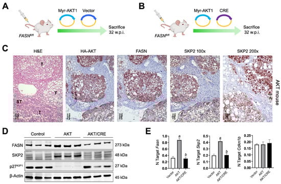 3.3. Depletion of FASN Inhibits AKT-Driven Hepatocarcinogenesis and Downregulates SKP2 in Mice