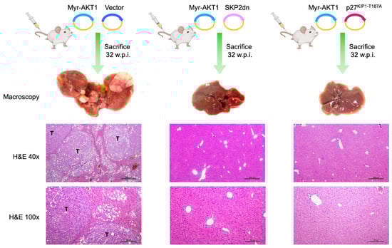 The pT3-EF1α, pT3-EF1α-HA-myr-AKT1, pT3-EF1α-HA-SKP2, pT3-EF1α-Cre, and pCMV/sleeping beauty transposase (SB) plasmids have been described previously [,]. The human SKP2 dominant negative (SKP2dn) cDNA was kindly provided by Dr. Michele Pagano (Laura and Isaac Perlmutter NYU Cancer Center, New York, NY, USA). This plasmid, also known as (ΔF)SKP2, consists of an F-box-deleted SKP2 mutant, which inhibits the degradation of p27KIP1 and sustains the stability of p27KIP1 []. The human p27KIP1-T187A cDNA was purchased from Addgene (#23048). The SKP2dn and p27KIP1-T187A cDNAs were cloned into a pT3-EF5a-HA and pT3-EF5a-V5 vectors, respectively, via the Gateway polymerase chain reaction (PCR) cloning strategy (Invitrogen, Carlsbad, CA, USA). The plasmids encoding the gene(s) of interest, along with sleeping beauty transposase (pCMV/SB) in a ratio of 25:1, were diluted in 2 mL saline (0.9% NaCl) for each mouse. Plasmids were purified using the Endotoxin-free Maxi prep kit (Sigma-Aldrich, St. Louis, MO, USA) before being injected into mice.