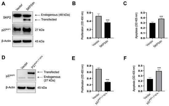 Inactivation of SKP2 or non-degradable p27KIP1 is detrimental to the growth of HCC cells in vitro. (A) Transfection of SKP2dn triggers the upregulation of p27KIP1 levels in SNU449 cells, as detected by Western blot analysis. As expected, transient transfection of SKP2dn resulted in the expression of a truncated form of SKP2 (transfected) with a lower molecular weight than the endogenous protein. β-Actin was used as a loading control. Transfection of SKP2dn reduces proliferation (B) and increases apoptosis (C) in the same cells. (D) Transfection of p27KIP1−187A results in the appearance of a second band (transfected) with a higher molecular weight than the endogenous p27KIP1 protein in the SNU449 cell line. β-Actin was used as a loading control. Similar to that described for SKP2dn, transfection of p27KIP1−187A decreases proliferation (E) and augments apoptosis (F) in the same cell line. Student’s t-test: p < 0.0001 *** vs. empty vector (control). Experiments were conducted three times in triplicate.