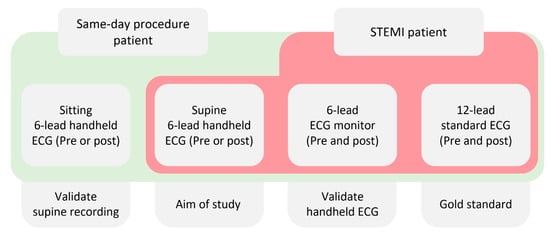 Among all patients with various types of STEMI who visit the emergency room and do not meet the exclusion criteria, an ECG using a 6-lead handheld device will be recorded, in addition to a basic 6-lead ECG monitor and a 12-lead ECG. In general, all patients with STEMI who visit the emergency room undergo a 12-lead ECG in the emergency room and then move to a catheterization laboratory for coronary angiography. In this study, the first 6-lead ECG by the handheld device will be recorded for 30 s in the supine position. To prevent any treatment delays, we will record the handheld ECG as part of the procedure preparation process, including the attachment of basic monitoring. If the first handheld recording is not available, it will be recorded before leaving the catheter lab.